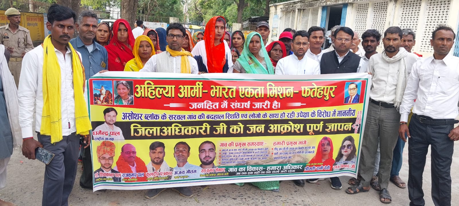 फतेहपुर। अहिल्या आर्मी भारत एकता मिशन के राष्ट्रीय अध्यक्ष धर्मेंद्र पाल के नेतृत्व में सैकड़ों ग्रामीणों ने जिलाधिकारी कार्यालय पहुंचकर ग्राम सरवल (ब्लॉक असोथर) की मूलभूत समस्याओं को लेकर ज्ञापन सौंपा।