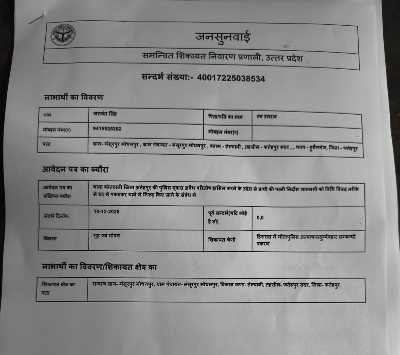 फतेहपुर। जिले की हुसैनगंज पुलिस पर एक परिवार ने गंभीर आरोप लगाए हैं। ग्राम मोधनपुर थाना हुसैनगंज निवासी जसवंत सिंह ने मुख्यमंत्री उत्तर प्रदेश शासन के अधीन गृह एवं गोपन विभाग को आईजीआरएस एवं ईमेल के माध्यम से शिकायती पत्र सौंपकर आरोप लगाया है कि पुलिस जानबूझकर उसके परिवार को मानसिक रूप से प्रताड़ित कर रही है। पत्र में कहा गया है कि पुलिस उसकी पत्नी ज्ञानमती को अवैध तरीके से पकड़कर थाने में ले गई, जिससे पूरा परिवार भयभीत है।